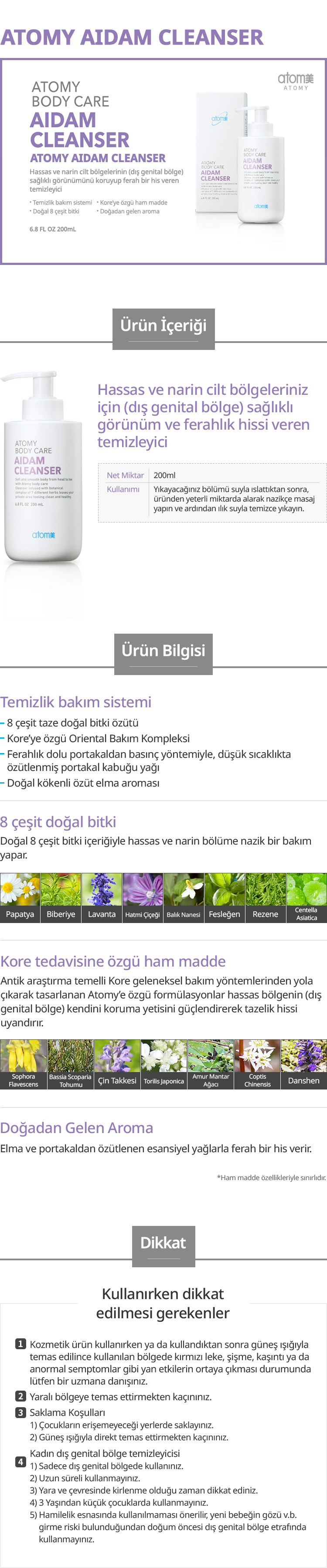 Atomy Aidam Temizleyici, doğal özler ve bitki ekstraktlarından oluşan özel bir formüle sahiptir. İçeriğinde yer alan aloe vera, papatya ve yeşil çay ekstraktları, cildinizi beslerken aynı zamanda sakinleştirici ve yatıştırıcı bir etki oluşturur. Cildin nem dengesini koruyarak, kuruluk ve tahriş gibi sorunların önüne geçer.