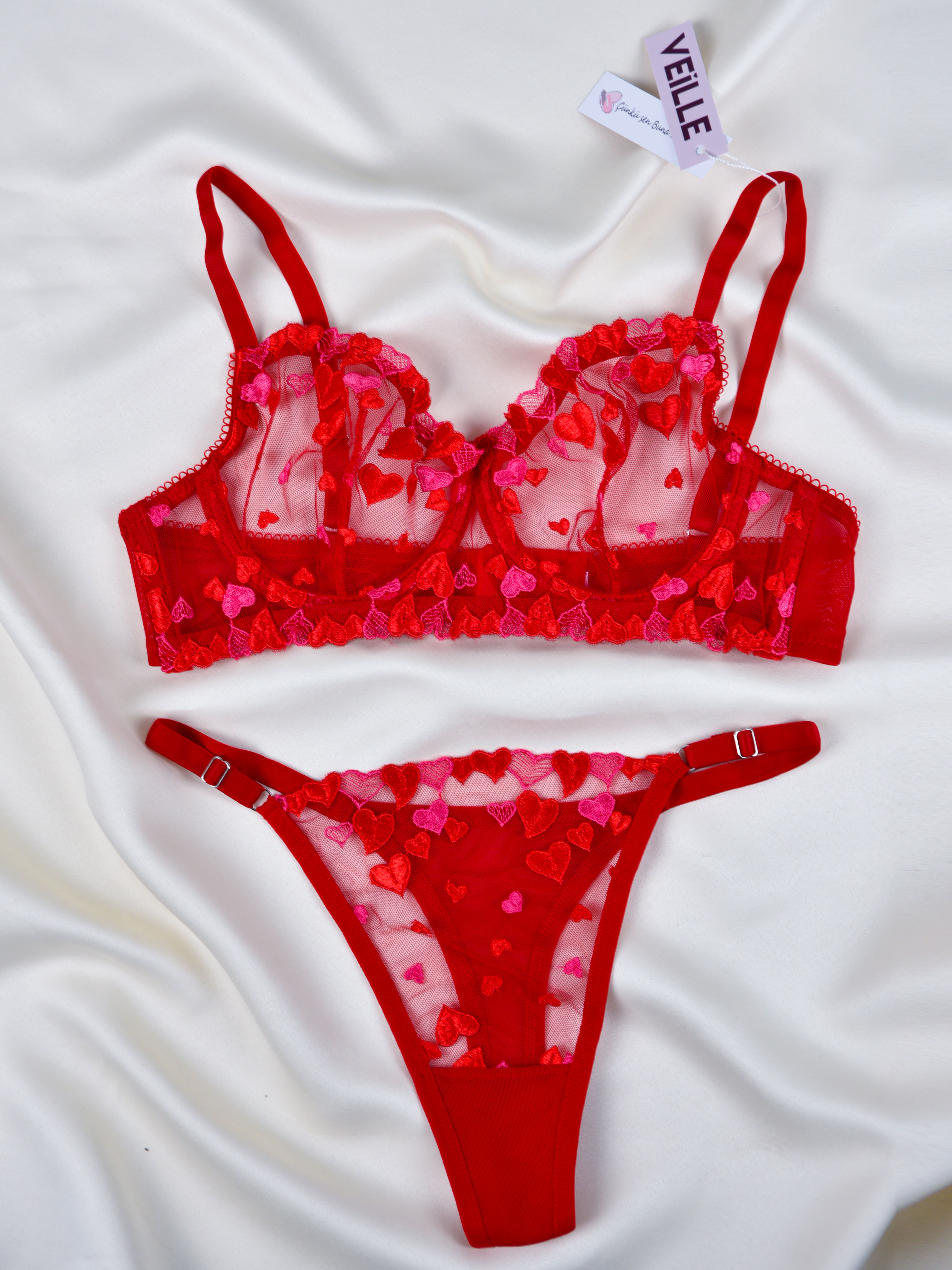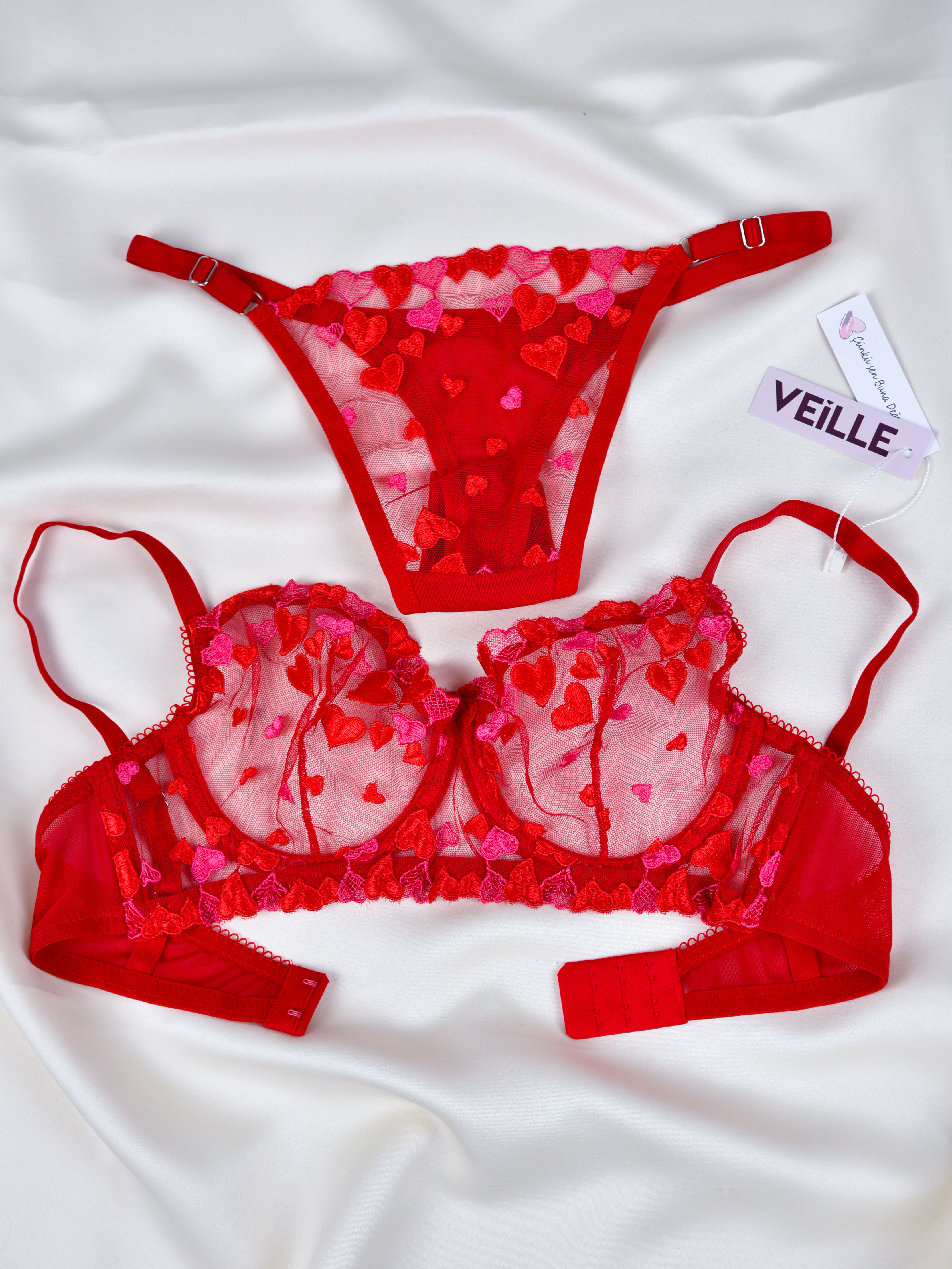 Kadın Kalpli Kırmızı Dantelli Balenli Sütyen Külot Takım