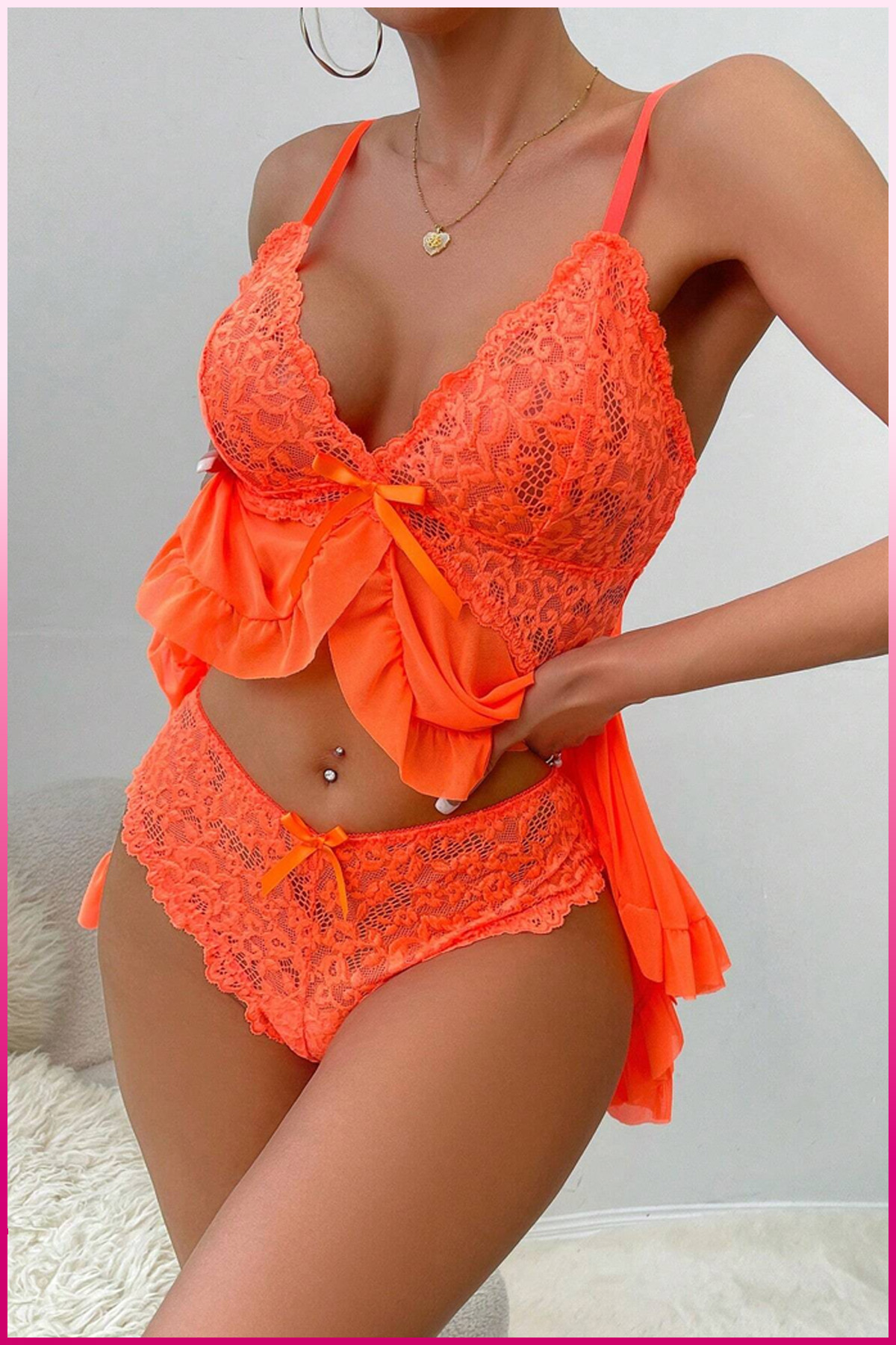 Kadın Zarif Turuncu Tül Gecelik ve Külot Takım