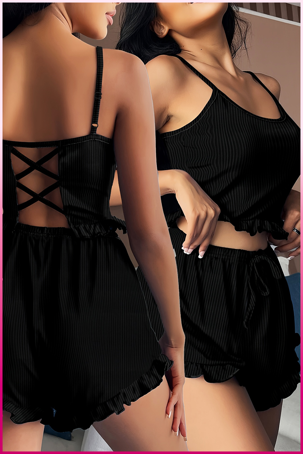 Siyah Mini Arkası Çapraz İpli Şortlu PijamaTakımı